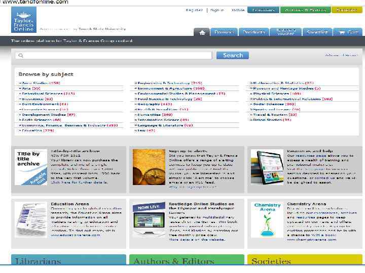 Taylor&Francis http: //www. tandfonline. com С платформы informaworld открыт доступ к журналам ведущего мирового издательства Taylor&Francis. По условиям подписки библиотека имеет полнотекстовый доступ только к журнальным публикациям. Коллекция журналов насчитывает более 1000 наименований по всем областям знаний.