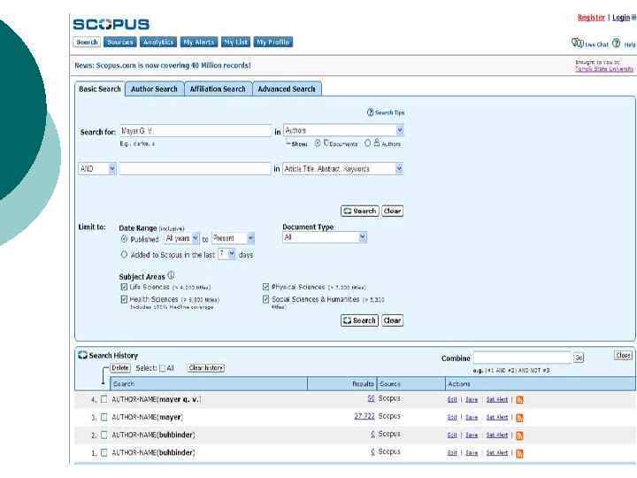 SCOPUS http: //www. scopus. com/ Система SCOPUS компании Elsevier представляет собой реферативную базу данных, которая обновляется ежедневно. Охват более 22 тысяч научных журналов из 4 тысяч крупнейших научных издательств мира, включая 340 российских реферируемых журналов, 13 миллионов патентов и 4 международных агентств, материалы научных конференций, глубина реферируемого массива более 40 лет (с 1966 года). Включена информация по российским организациям и российским авторам, в частности показатели цитируемости.