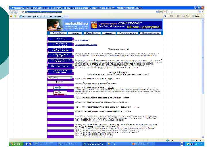 Образовательный портал Ucheba. com http: //www. uroki. ru/met_rus/podpiska_liders. htm Содержит материалы, полезные для психолога и педагогических работников. Это — психологические методики, внутришкольный контроль, дошкольное воспитание, аттестация, внеклассная работа и т. д.