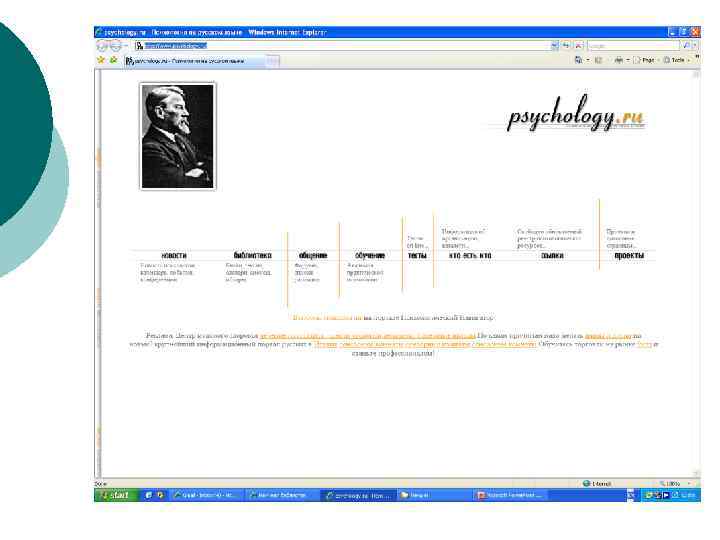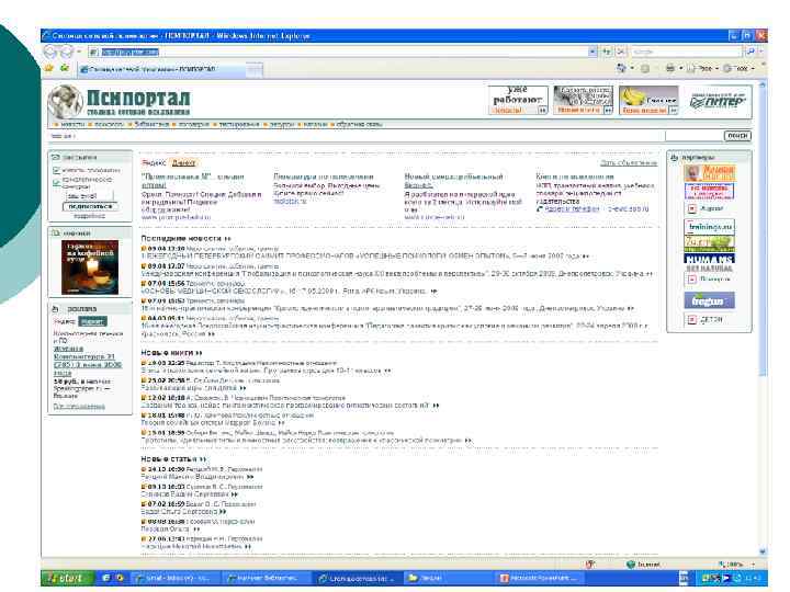 Мир психологии http: //www. psychology. net. ru/ Научно-популярный информационный психологический портал. Публикации, статьи, книги. Психологические тренинги, семинары тесты, форум. Коллекция рефератов. Новости из мира психологии, форум. Персоналии. Каталог ссылок.