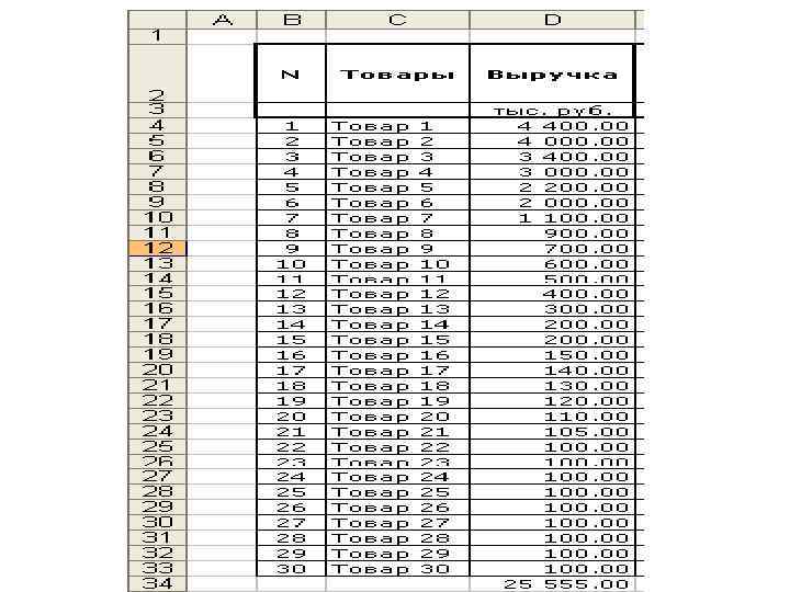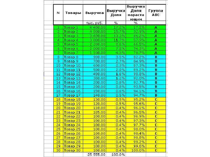 Пример ABC-анализа ассортимента расчет в Excel по шагам Покажем на примере как работает методика ABCанализа. Возьмем ассортимент из 30 условных товаров. • Цель анализа — оптимизация ассортимента. • Объект анализа — товары. • Параметр по которому будем производить разбиение на группы — выручка. • Cписок товаров отсортировали в порядке убывания выручки. • Подсчитали общую сумму выручки по всем товарам.