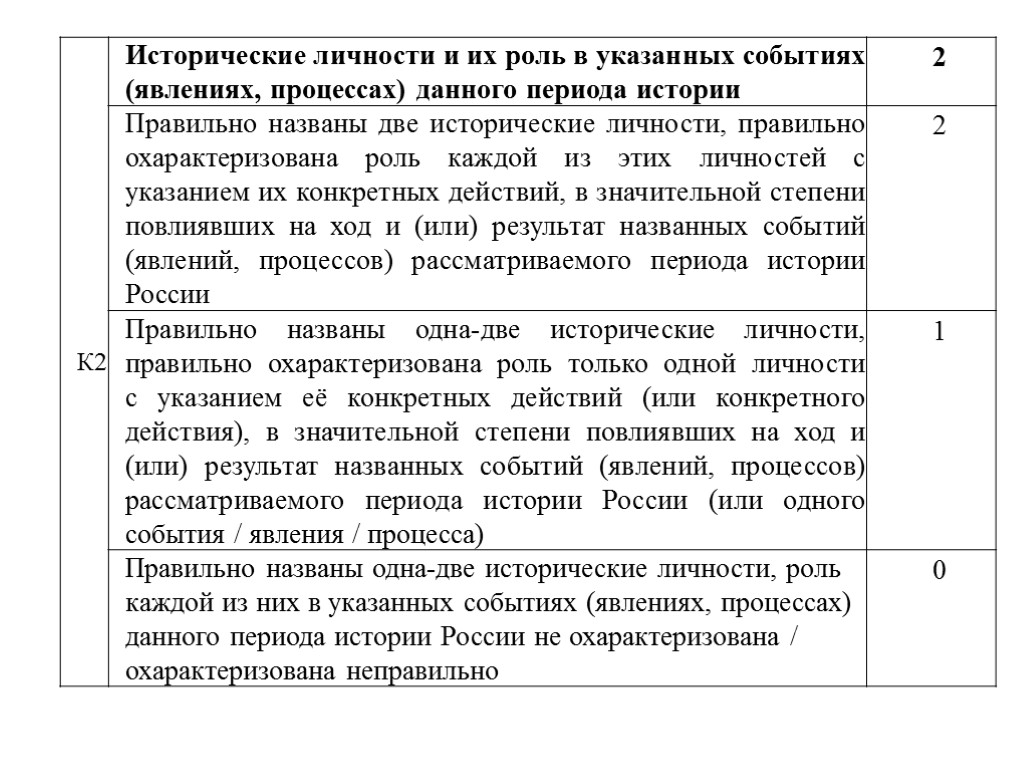 По критерию К2 оценивается указание исторических личностей, деятельность которых связана с названными событиями (явлениями, процессами), и характеристика роли этих личностей в названных событиях (явлениях, процессах). Под ролью исторической личности следует понимать её конкретные действия (см. текст задания, выделенный курсивом в рамке), в значительной степени повлиявшие на ход и (или) результат указанных событий (процессов, явлений). Конкретные действия всегда носят единичный характер и выражаются в непосредственном проявлении личной активности историческим деятелем. События (процессы, явления), в которых личность сыграла охарактеризованную в сочинении роль, обязательно должны быть названы. Для выставления максимального балла по критерию К2 в ответе должны быть названы два исторических деятеля и роли (конкретные действия) обоих в названных в сочинении событиях (явлениях, процессах). Указание роли личности в событии не должно подменяться указанием других характеристик (например, занимаемой должности, титула и т.п.).