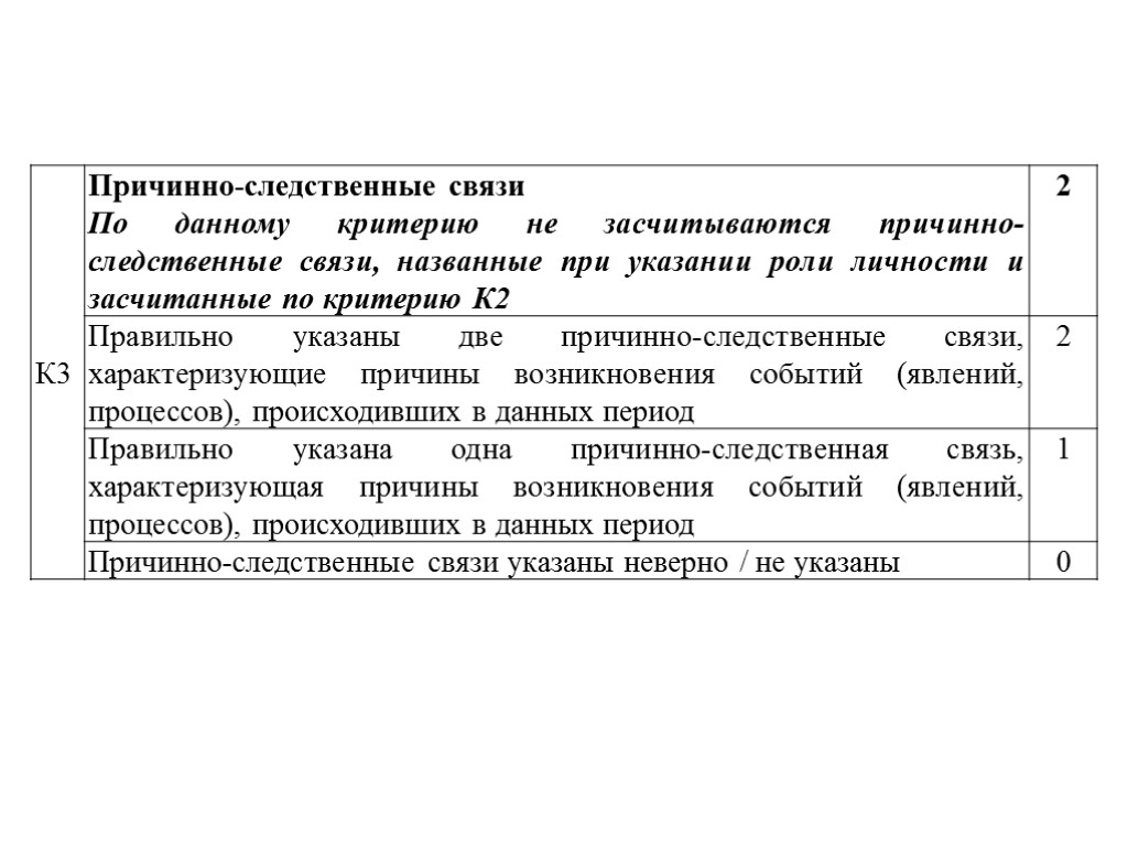 По критерию К3 оценивается указание в сочинении причинно-следственных связей. Под причинно-следственной связью следует понимать связь между историческими событиями (процессами, явлениями), при которой одно событие (процесс, явление), называемое причиной, при наличии определенных исторических условий порождает другое событие (процесс, явление), называемое следствием. При указании причинно-следственных связей могут быть использованы не только причины, но и предпосылки событий (явлений, процессов). Указанные причинно-следственные связи должны характеризовать причины возникновения событий (явлений, процессов), происходивших в данных период. Это значит, что они могут выходить за нижнюю границу периода. Нельзя путать причинно-следственные связи, указанные выпускником в рамках данного периода, путать с оценкой значимости данного периода, которая, хотя и имеет определённые характеристики причинно-следственных отношений, но всегда выходит за верхнюю границу данного периода истории. По критерию К3 не учитываются указания роли личности в событиях (процессах, явлениях) данного периода (уже учтенные по критерию К2), даже в том случае, если эти указания роли содержат элементы причинно-следственных связей.