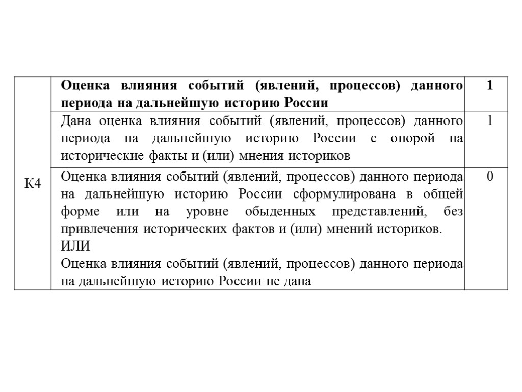 По критерию К4 выпускник может получить один балл за правильное указание оценки влияние событий (явлений, процессов) данного периода на дальнейшую историю России. Оценка представляет собой вывод о влиянии событий (явлений, процессов) данного периода именно на последующие эпохи. Это означает, что выпускник обязательно должен выйти за верхнюю границу периода. Согласно критериям, оценка может быть дана с опорой на исторические факты и (или) мнения историков. Это означает, что указание мнений историков в работе не обязательно, выпускник может для оценки периода использовать только знание фактов. Не может быть засчитана общая формулировка, лишённая конкретного содержания.
