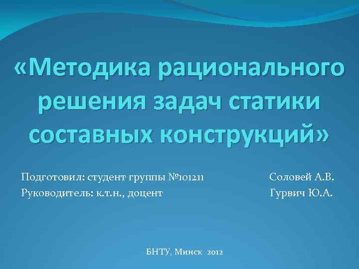 «Методика рационального решения задач статики составных конструкций» Подготовил: студент группы № 101211 Соловей А. В. Руководитель: к. т. н. , доцент Гурвич Ю. А. БНТУ, Минск 2012