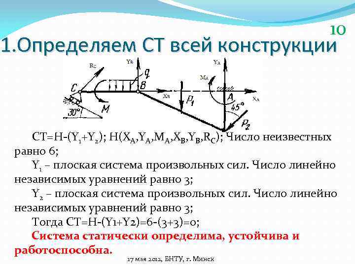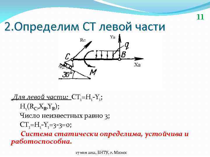2. Определим СТ левой части Для левой части: СТ 1=Н 1 -Y 1; Н 1(RC, XB, YB); Число неизвестных равно 3; СТ 1=Н 1 -Y 1=3 -3=0; Система статически определима, устойчива и работоспособна. 17 мая 2012, БНТУ, г. Минск 11