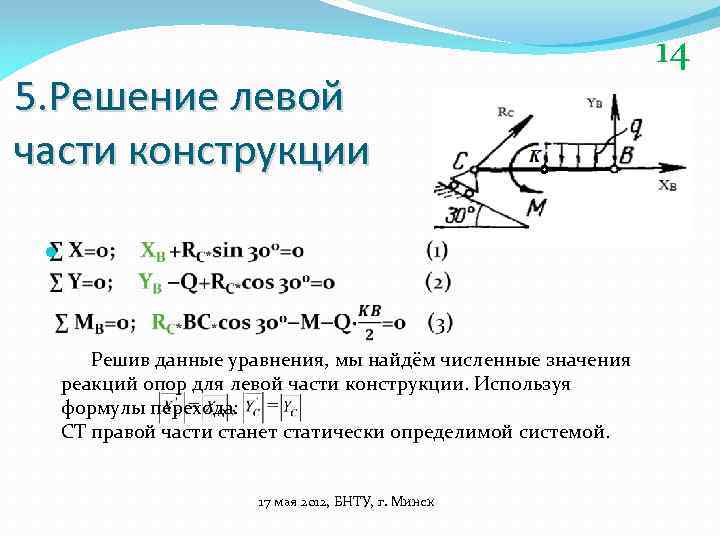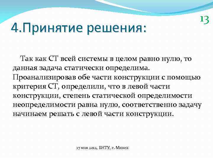 4. Принятие решения: 13 Так как СТ всей системы в целом равно нулю, то данная задача статически определима. Проанализировав обе части конструкции с помощью критерия СТ, определили, что в левой части конструкции, степень статической определимости неопределимости равна нулю, соответственно задачу начинаем решать с левой части конструкции. 17 мая 2012, БНТУ, г. Минск