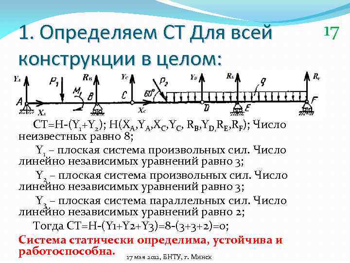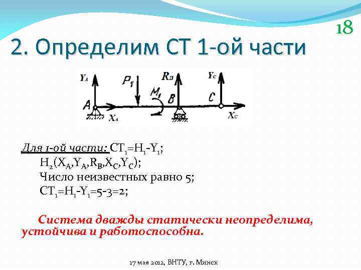 1. Определяем СТ Для всей конструкции в целом: СТ=Н-(Y 1+Y 2); H(XA, YA, XC, YC, RB, YD, RE, RF); Число неизвестных равно 8; Y 1 – плоская система произвольных сил. Число линейно независимых уравнений равно 3; Y 2 – плоская система произвольных сил. Число линейно независимых уравнений равно 3; Y 3 – плоская система параллельных сил. Число линейно независимых уравнений равно 2; Тогда СТ=Н-(Y 1+Y 2+Y 3)=8 -(3+3+2)=0; Система статически определима, устойчива и работоспособна. 17 мая 2012, БНТУ, г. Минск 17