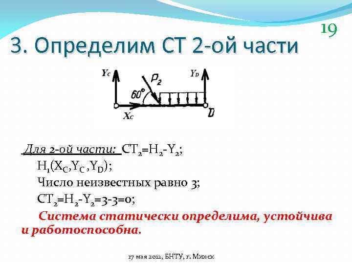 2. Определим СТ 1 -ой части Для 1 -ой части: СТ 1=Н 1 -Y 1; Н 2(XA, YA, RB, XС, YС); Число неизвестных равно 5; СТ 1=Н 1 -Y 1=5 -3=2; Система дважды статически неопределима, устойчива и работоспособна. 17 мая 2012, БНТУ, г. Минск 18