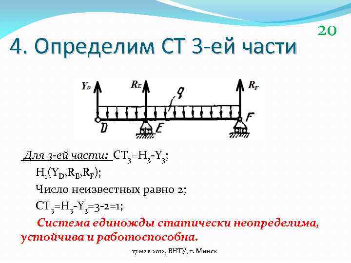 3. Определим СТ 2 -ой части 19 Для 2 -ой части: СТ 2=Н 2 -Y 2; Н 1(XС, YС , YD); Число неизвестных равно 3; СТ 2=Н 2 -Y 2=3 -3=0; Система статически определима, устойчива и работоспособна. 17 мая 2012, БНТУ, г. Минск