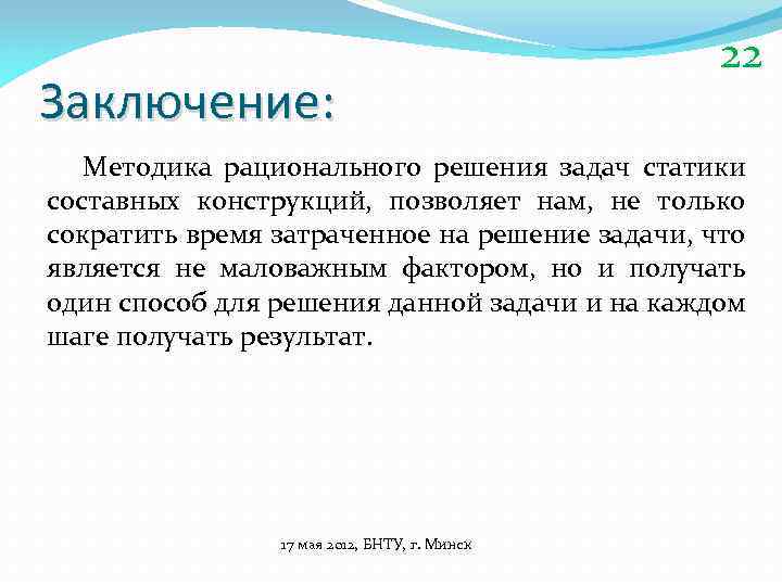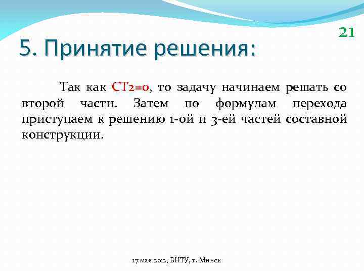 5. Принятие решения: 21 Так как СТ 2=0, то задачу начинаем решать со второй части. Затем по формулам перехода приступаем к решению 1 -ой и 3 -ей частей составной конструкции. 17 мая 2012, БНТУ, г. Минск