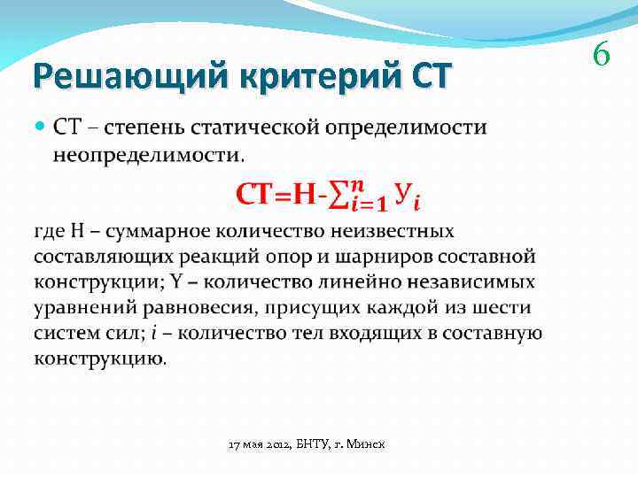 Критерии: 5 Ø Число линейно независимых уравнений равновесия и количество слагаемых в них нужно сводить к минимуму. Ø Желательно, чтобы в уравнения равновесия моментов сил относительно точки входила одна неизвестная. Ø Желательно, на каждом шаге получать результат. Ø Работоспособность конструкции. Ø Устойчивость конструкции. Ø Решающий критерий СТ. 17 мая 2012, БНТУ, г. Минск