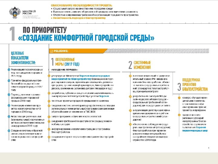 Нужно обновлять и создавать новые парки, скверы, зоны отдыха, пешеходные улицы, площадки для занятий спортом. Правительство должно поддержать те регионы, которые готовы включиться в создание таких современных городских пространств, комфортных и необходимых людям. В. В. Путин Из выступления на заседании Государственного Совета Российской Федерации 17 мая 2016 года