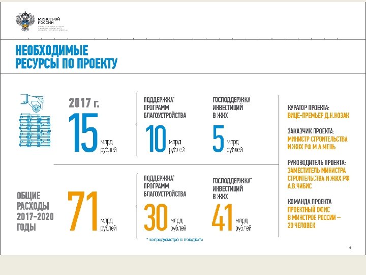 Зачем и что дальше? Андрей Чибис – заместитель Министра строительства и жилищнокоммунального хозяйства Российской Федерации, куратор проекта по созданию комфортной городской среды и обеспечение качества жилищнокоммунальных услуг. 1. Какие критерии эффективности реализации проекта по формирования комфортной среды ? 2. Что будет дальше ? Возможности финансирования проекта после завершения? 3. Какие механизмы вовлечения населения в реализацию и эксплуатацию проекта?