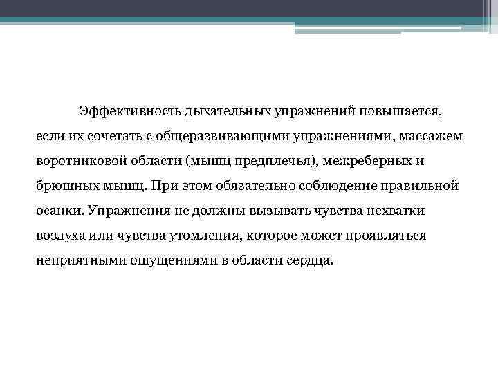 Эффективность дыхательных упражнений повышается, если их сочетать с общеразвивающими упражнениями, массажем воротниковой области (мышц предплечья), межреберных и брюшных мышц. При этом обязательно соблюдение правильной осанки. Упражнения не должны вызывать чувства нехватки воздуха или чувства утомления, которое может проявляться неприятными ощущениями в области сердца.