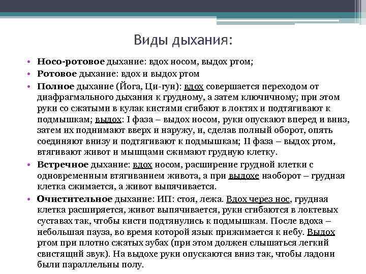Виды дыхания: • Носо-ротовое дыхание: вдох носом, выдох ртом; • Ротовое дыхание: вдох и выдох ртом • Полное дыхание (Йога, Ци-гун): вдох совершается переходом от диафрагмального дыхания к грудному, а затем ключичному; при этом руки со сжатыми в кулак кистями сгибают в локтях и подтягивают к подмышкам; выдох: І фаза – выдох носом, руки опускают вперед и вниз, затем их поднимают вверх и наружу, и, сделав полный оборот, опять соединяют внизу и подтягивают к подмышкам; ІІ фаза – выдох ртом, втягивают живот и мышцами сжимают грудную клетку. • Встречное дыхание: вдох носом, расширение грудной клетки с одновременным втягиванием живота, а при выдохе наоборот – грудная клетка сжимается, а живот выпячивается. • Очистительное дыхание: ИП: стоя, лежа. Вдох через нос, грудная клетка расширяется, живот выпячивается, руки сгибаются в локтевых суставах так, чтобы кисти подтянулись к подмышкам. После вдоха – небольшая пауза, во время которой язык прижимается к небу. Выдох ртом при плотно сжатых зубах (при этом должен слышаться легкий свистящий звук). На выдохе руки опускаются вниз так, чтобы ладони были параллельны полу.