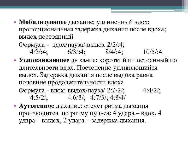 • Мобилизующее дыхание: удлиненный вдох; пропорциональная задержка дыхания после вдоха; выдох постоянный Формула - вдох/пауза/: выдох 2/2/: 4; 4/2/: 4; 6/3/: 4; 8/4/: 4; 10/5/: 4 • Успокаивающее дыхание: короткий и постоянный по длительности вдох. Постепенно удлиняющийся выдох. Задержка дыхания после выдоха равна половине продолжительности вдоха Формула - вдох: выдох/пауза/ 2: 2/2/; 4: 4/2/; 4: 5/2/; 4: 6/3/; 4: 7/3/; 4: 8/4/ • Аутогенное дыхание: отсчет ритма дыхания производится по ритму пульса: 4 удара – вдох, 4 удара – выдох, 2 удара – задержка дыхания.