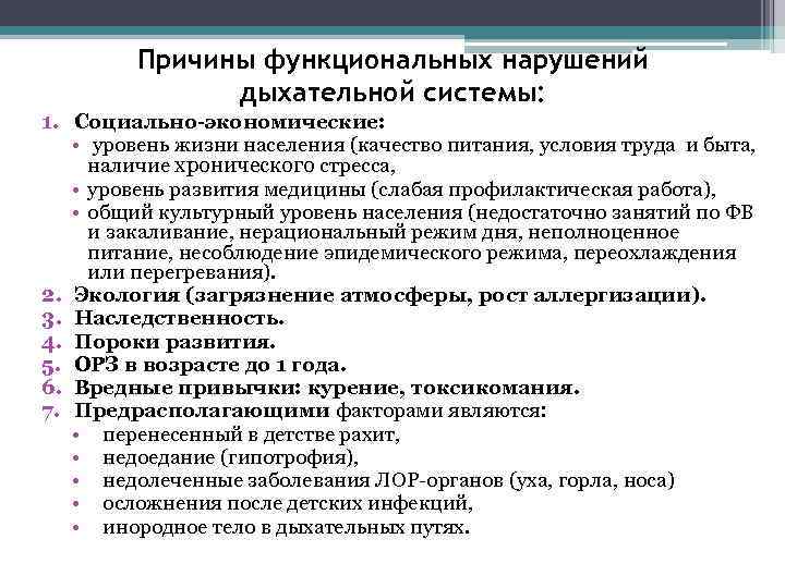 Причины функциональных нарушений дыхательной системы: 1. Социально-экономические: • уровень жизни населения (качество питания, условия труда и быта, наличие хронического стресса, • уровень развития медицины (слабая профилактическая работа), • общий культурный уровень населения (недостаточно занятий по ФВ и закаливание, нерациональный режим дня, неполноценное питание, несоблюдение эпидемического режима, переохлаждения или перегревания). 2. Экология (загрязнение атмосферы, рост аллергизации). 3. Наследственность. 4. Пороки развития. 5. ОРЗ в возрасте до 1 года. 6. Вредные привычки: курение, токсикомания. 7. Предрасполагающими факторами являются: • перенесенный в детстве рахит, • недоедание (гипотрофия), • недолеченные заболевания ЛОР-органов (уха, горла, носа) • осложнения после детских инфекций, • инородное тело в дыхательных путях.