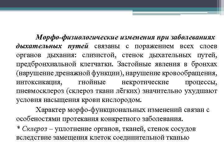 Морфо-физиологические изменения при заболеваниях дыхательных путей связаны с поражением всех слоев органов дыхания: слизистой, стенок дыхательных путей, предбронхиальной клетчатки. Застойные явления в бронхах (нарушение дренажной функции), нарушение кровообращения, интоксикация, гнойные некротические процессы, пневмосклероз (склероз ткани лёгких) значительно ухудшают условия насыщения крови кислородом. Характер морфо-функциональных изменений связан с особеностями протекания конкретного заболевания. * Склероз – уплотнение органов, тканей, стенок сосудов вследствие замещения клеток соединительной тканью