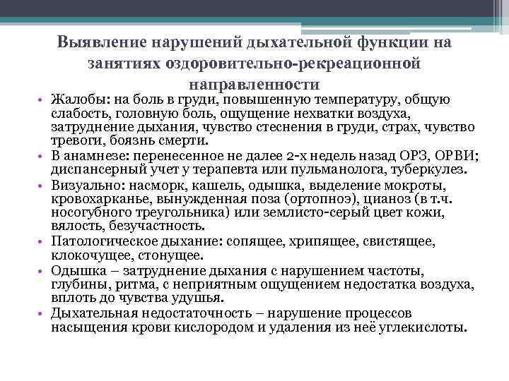 Выявление нарушений дыхательной функции на занятиях оздоровительно-рекреационной направленности • Жалобы: на боль в груди, повышенную температуру, общую слабость, головную боль, ощущение нехватки воздуха, затруднение дыхания, чувство стеснения в груди, страх, чувство тревоги, боязнь смерти. • В анамнезе: перенесенное не далее 2 -х недель назад ОРЗ, ОРВИ; диспансерный учет у терапевта или пульманолога, туберкулез. • Визуально: насморк, кашель, одышка, выделение мокроты, кровохарканье, вынужденная поза (ортопноэ), цианоз (в т. ч. носогубного треугольника) или землисто-серый цвет кожи, вялость, безучастность. • Патологическое дыхание: сопящее, хрипящее, свистящее, клокочущее, стонущее. • Одышка – затруднение дыхания с нарушением частоты, глубины, ритма, с неприятным ощущением недостатка воздуха, вплоть до чувства удушья. • Дыхательная недостаточность – нарушение процессов насыщения крови кислородом и удаления из неё углекислоты.