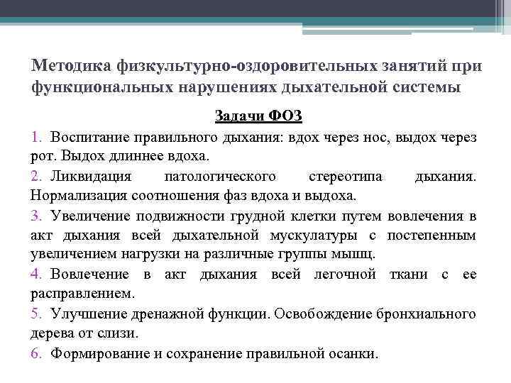 Методика физкультурно-оздоровительных занятий при функциональных нарушениях дыхательной системы Задачи ФОЗ 1. Воспитание правильного дыхания: вдох через нос, выдох через рот. Выдох длиннее вдоха. 2. Ликвидация патологического стереотипа дыхания. Нормализация соотношения фаз вдоха и выдоха. 3. Увеличение подвижности грудной клетки путем вовлечения в акт дыхания всей дыхательной мускулатуры с постепенным увеличением нагрузки на различные группы мышц. 4. Вовлечение в акт дыхания всей легочной ткани с ее расправлением. 5. Улучшение дренажной функции. Освобождение бронхиального дерева от слизи. 6. Формирование и сохранение правильной осанки.