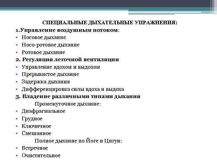 СПЕЦИАЛЬНЫЕ ДЫХАТЕЛЬНЫЕ УПРАЖНЕНИЯ: 1. Управление воздушным потоком: • Носовое дыхание • Носо-ротовое дыхание • Ротовое дыхание 2. Регуляция легочной вентиляции • Управление вдохом и выдохом • Прерывистое дыхание • Задержка дыхания • Дифференцировка силы вдоха и выдоха 3. Владение различными типами дыхания Промежуточное дыхание: • Диафрагмальное • Грудное • Ключичное • Смешанное Полное дыхание по Йоге и Цигун: • Встречное • Очистительное