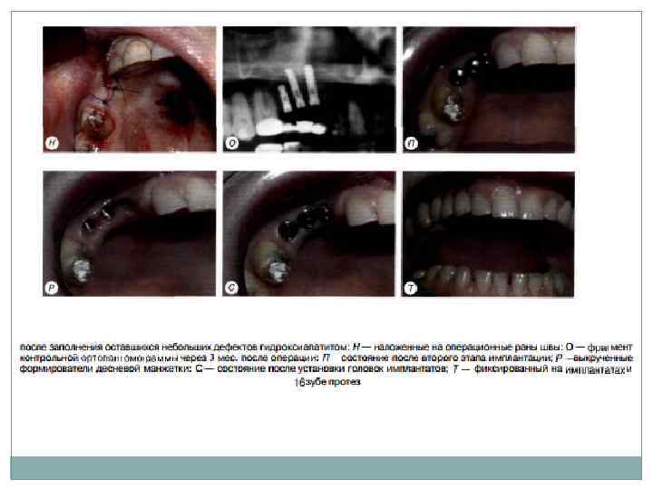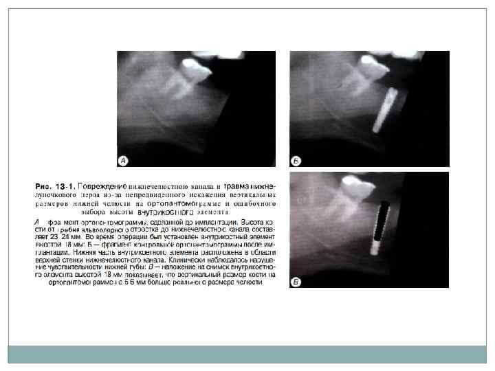 Лечение В первых двух случаях можно установить выкручивающийся внутрикостный элемент на ме сто , назначить препараты кальция, оптимизиру ющие процесс минерализации, осуществить по вторно второй этап операции через 1 1, 5 мес. В третьем случае необходимо провести реимплантацию с учетом особенности архитектоники кости.