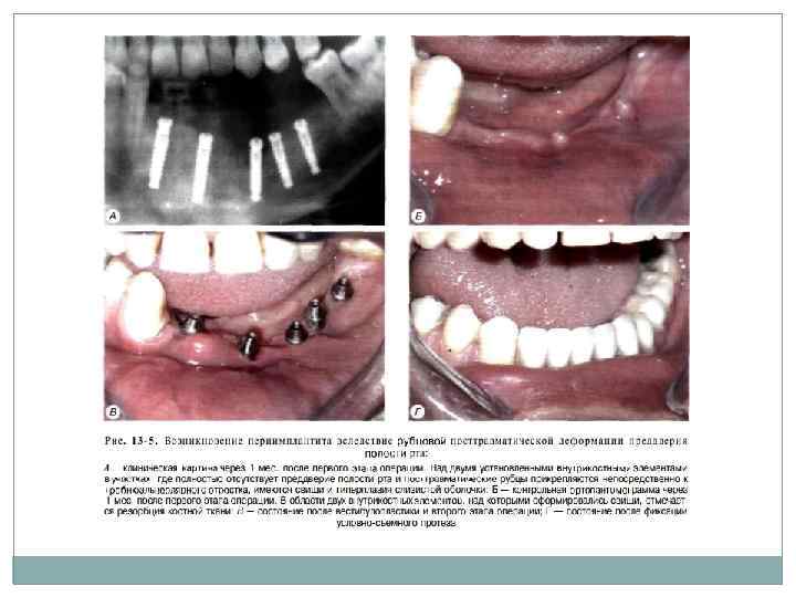 Периимплантит после одноэтапной методики проявляется: болезненностью при надавливании на имплантат; гиперемией и отеком слизистой оболочки, окружающей выступающую в полость рта часть имплантата; отсутствием подвижности или незначительной боковой подвижностью им плантата. Рентгенологически определяется очаг резорбции на границе раздела имплантат кость или образование костного кармана в области вы хода имплантата из кости (рис. 13 4).