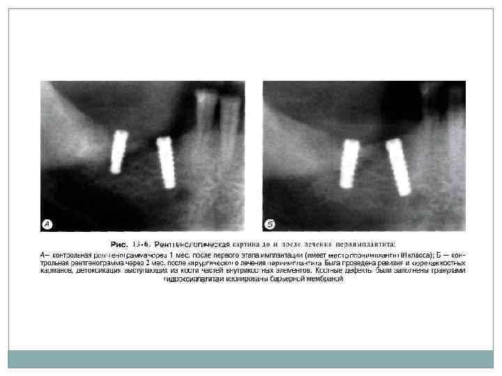 Клиническая картина периимплантита в об ласти введенного во время первого этапа вну трикостного элемента имеет свои особенности. Как правило, через 2 3 нед. после операции по являются ограниченный отек и гиперемия, свищ иди грануляции в области слизистой оболочки, покрывающей внутрикостный элемент. Пред вестниками периимплантита при двухэтанной методике являются сохраняющийся в течение недели после операции отек и подвижность участка слизистой оболочки в месте установлен ного внутрикостного элемента. Рентгенологически определяется очаг резорб ции вдоль границы раздела имплантат/кость или образование костного кармана.