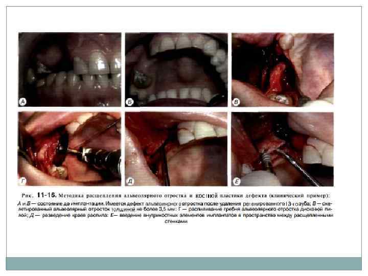 Расщепление альвеолярного гребня Первичная стабилизация имплантата зачастую невозможна в случае узкого альвеолярного гребня. Устранить горизонтальный дефицит костной ткани альвеолярного отростка верхней челюсти и альвеолярной части нижней челюсти можно за счет расщепления или расширения кости, и, таким образом, достичь достаточной ширины для препарирования имплантационного ложа. Суть метода заключается в продольной остеотомии альвеолярного гребня в саггитальной плоскости с помощью специальных инструментов, которые устанавливают между двумя кортикальными пластинами и которыми постепенно расширяют альвеолярную часть челюсти, перемещая вестибулярно щечную кортикальную пластину с частью губчатого вещества, что, в свою очередь, позволяет одномоментно или спустя 4 6 мес установить дентальные имплантаты стандартного диаметра. Вестибулярная кортикальная пластина надламывается по типу «зеленой ветки» , а образовавшееся пространство между кортикальными пластинами заполняется аллогенными, аллопластическими или аутогенными костными материалами.