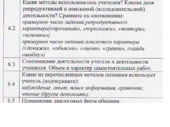 6. Методика проведения урока: 6. 1. Актуализация знаний и способов деятельности учащихся. Постановка проблемных вопросов, создание проблемной ситуации. 6. 2. Какие методы использовались учителем. Какова доля репродуктивной и поисковой (исследовательской) деятельности? Сравни соотношение: примерное число заданий репродуктивного характера: ( «прочитай» , «перескажи» , «повтори» , «вспомни» ) и примерное число заданий поискового характера( «докажи» , «объясни» , «оцени» , «сравни» , «найди ошибку» )