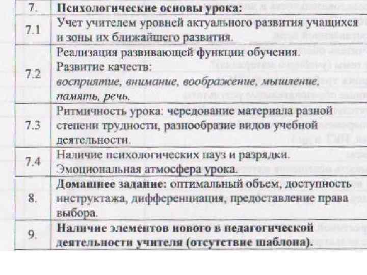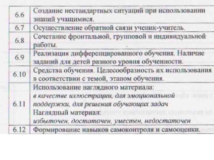 5. Инструментарий учителя Эффективное использования инструментария учителя для (технология, методы, достижения результатов взаимодействия. приемы). Адекватность выбранных форм, методов и приемов, направленных на формирование и развитие УУД в соответствии с возрастными особенностями учащихся. 6. Дидактическое оснащение Разнообразие заданий различного типа, вида и формы. урока. Использование учителем разных источников информации. Оптимальность, целесообразность и формы организации ИКТ на уроке. 7. Формирование и развитие Соответствие уровня сложности заданий, направленных на УДД. формирование и развитие УДД: личностных, познавательных, коммуникативных, регулятивных. 8. Организация контроля и результатов обучения. Разнообразие применяемых форм контроля результатов обучения в течение урока. 9. Результативность Результат совместной учебной деятельности на каждом этапе совместной деятельности по урока. Разнообразие форм представления результата достижению учебных целей. совместной деятельности (проект, план, тезисы, аннотация, тест, контрольное упражнение и т. д. ). Формы самооценки (рефлексия) деятельности уч-ся. 10. Стиль общения. Деятельность учителя по созданию и поддержанию психологического комфорта на уроке при общении с каждым учеником.