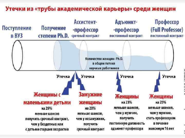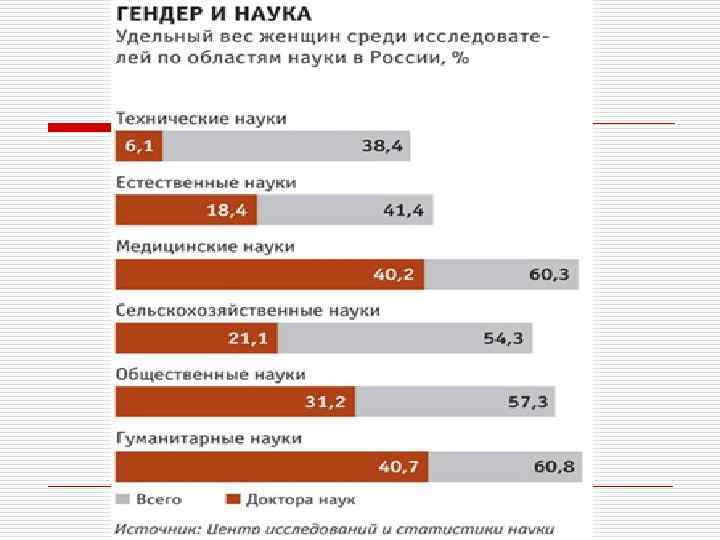 Женщины в науке o По данным института статистики ЮНЕСКО, в науке доминируют мужчины: женщины составляют лишь четверть международного научного сообщества. o Среди университетских профессоров их около 10%, а среди членов академий наук – менее 5%. o Россия по общей численности женщин-учёных выгодно отличается от других стран (почти 42% занятых в сфере исследований и разработок). o Среди 528 академиков РАН только 10 женщин, то есть всего около 2%. o Для сравнения: из 2200 членов Национальной академии США (NAS) примерно 260 женщин. Это приблизительно 12%.