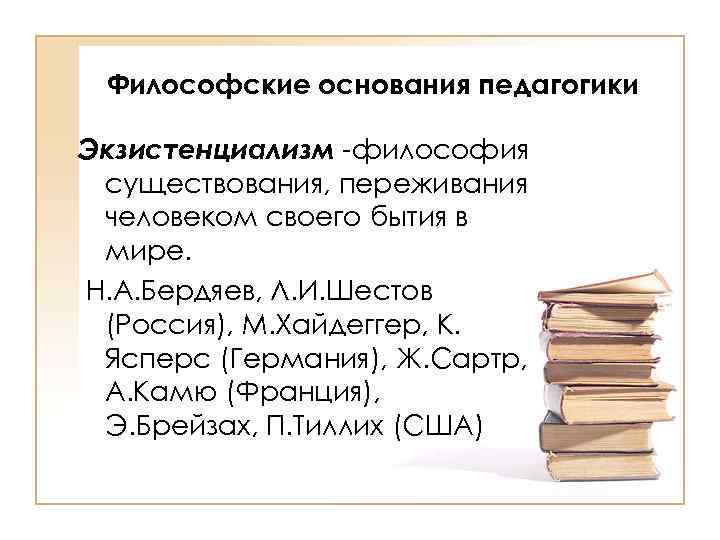 Философские основания педагогики Экзистенциaлизм -философия существования, переживания человеком своего бытия в мире. Н. А. Бердяев, Л. И. Шестов (Россия), М. Хайдеггер, К. Ясперс (Германия), Ж. Сартр, А. Камю (Франция), Э. Брейзах, П. Тиллих (США)