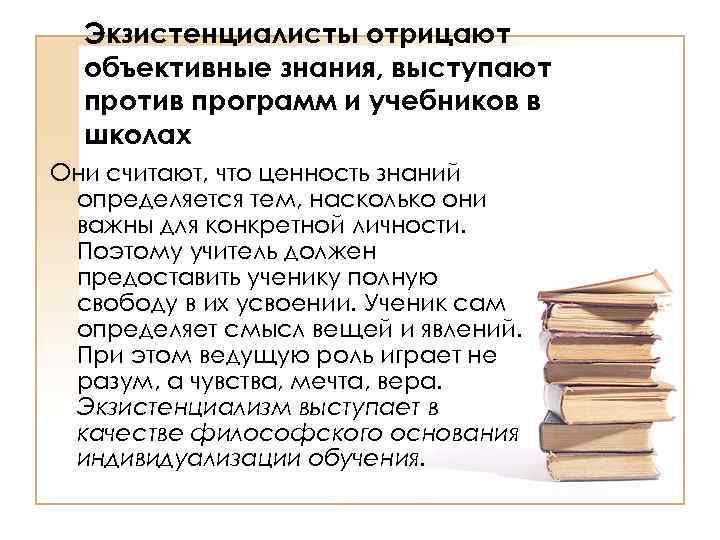 Экзистенциалисты отрицают объективные знания, выступают против программ и учебников в школах Они считают, что ценность знаний определяется тем, насколько они важны для конкретной личности. Поэтому учитель должен предоставить ученику полную свободу в их усвоении. Ученик сам определяет смысл вещей и явлений. При этом ведущую роль играет не разум, а чувства, мечта, вера. Экзистенциализм выступает в качестве философского основания индивидуализации обучения.