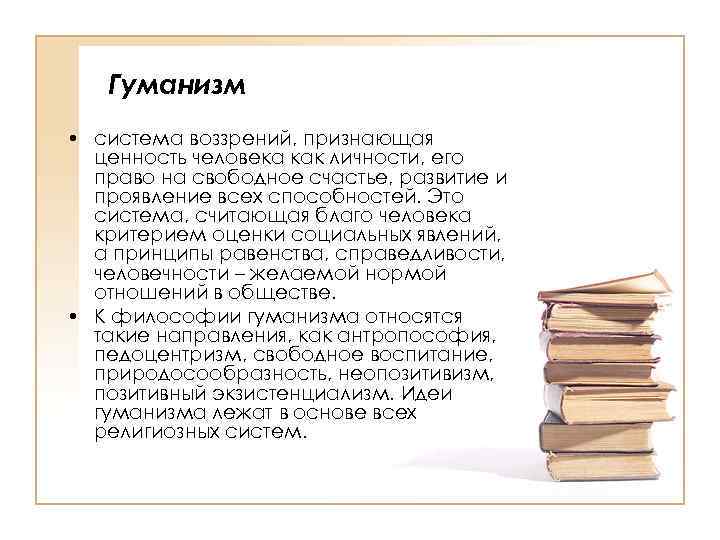 Гуманизм • система воззрений, признающая ценность человека как личности, его право на свободное счастье, развитие и проявление всех способностей. Это система, считающая благо человека критерием оценки социальных явлений, а принципы равенства, справедливости, человечности – желаемой нормой отношений в обществе. • К философии гуманизма относятся такие направления, как антропософия, педоцентризм, свободное воспитание, природосообразность, неопозитивизм, позитивный экзистенциализм. Идеи гуманизма лежат в основе всех религиозных систем.