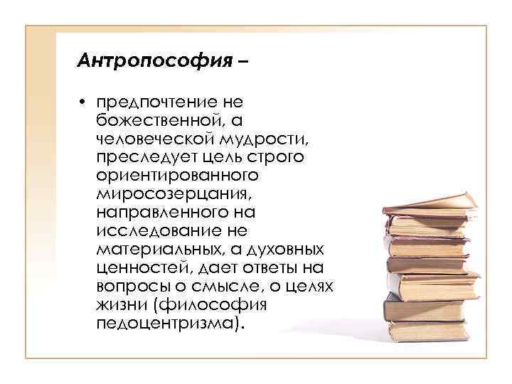 Антропософия – • предпочтение не божественной, а человеческой мудрости, преследует цель строго ориентированного миросозерцания, направленного на исследование не материальных, а духовных ценностей, дает ответы на вопросы о смысле, о целях жизни (философия педоцентризма).