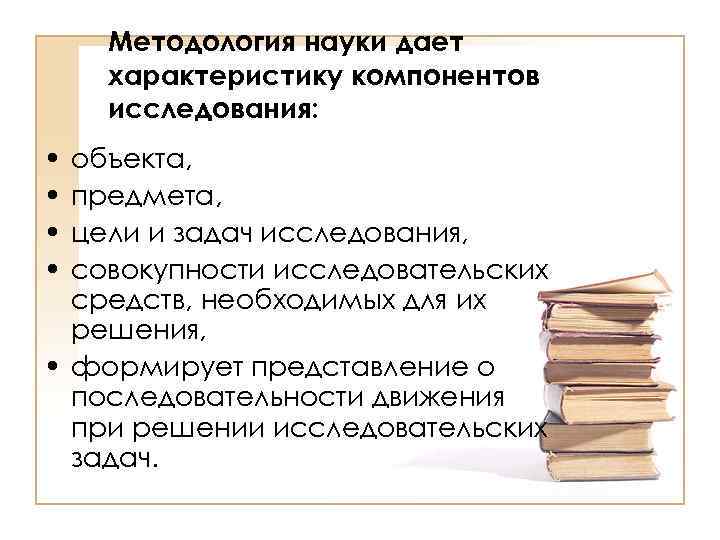 Методология науки дает характеристику компонентов исследования: • • объекта, предмета, цели и задач исследования, совокупности исследовательских средств, необходимых для их решения, • формирует представление о последовательности движения при решении исследовательских задач.