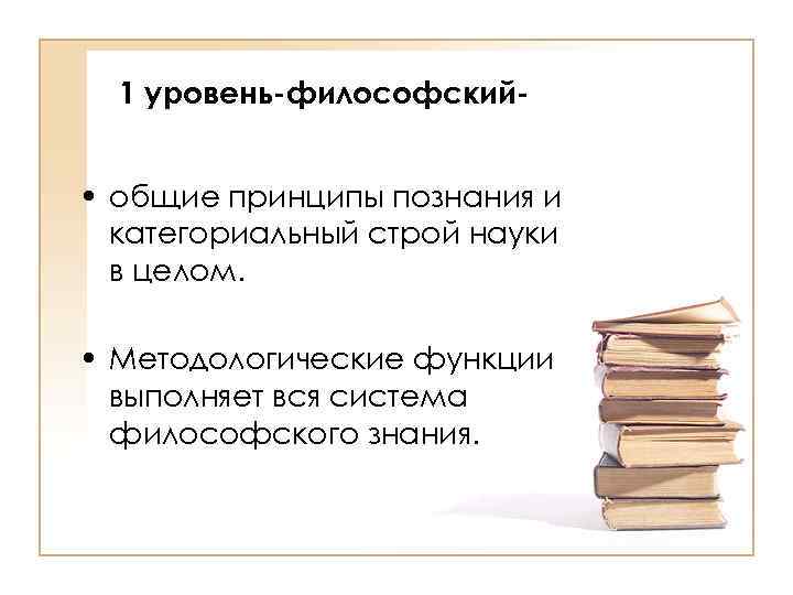 1 уровень-философский- • общие принципы познания и категориальный строй науки в целом. • Методологические функции выполняет вся система философского знания.