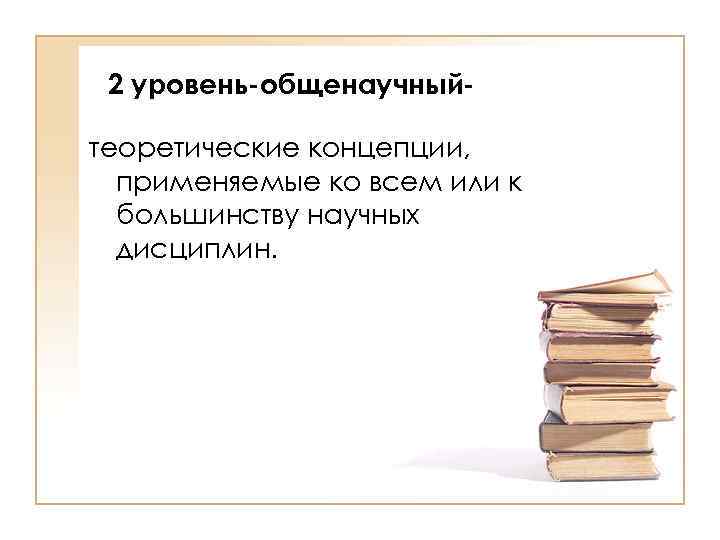 2 уровень-общенаучныйтеоретические концепции, применяемые ко всем или к большинству научных дисциплин.