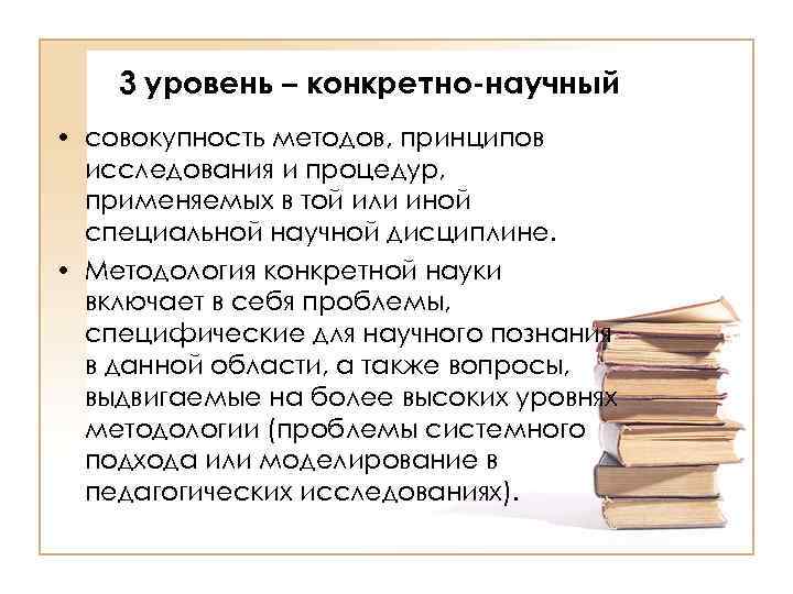 3 уровень – конкретно-научный • совокупность методов, принципов исследования и процедур, применяемых в той или иной специальной научной дисциплине. • Методология конкретной науки включает в себя проблемы, специфические для научного познания в данной области, а также вопросы, выдвигаемые на более высоких уровнях методологии (проблемы системного подхода или моделирование в педагогических исследованиях).