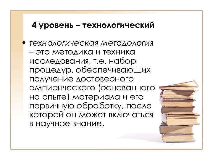 4 уровень – технологический • технологическая методология – это методика и техника исследования, т. е. набор процедур, обеспечивающих получение достоверного эмпирического (основанного на опыте) материала и его первичную обработку, после которой он может включаться в научное знание.