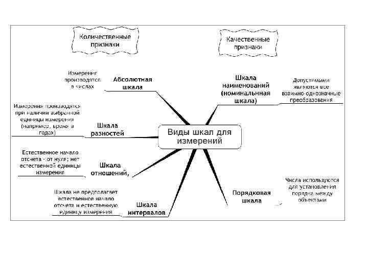 Шкала Определение Упорядочен ность Интервал ьность Нулевая точка Наименований (номинальная или классификационная) Конечный набор обозначений для никак не связанных между собой состояний объекта нет нет Порядковая Сравнение разных классов наблюдаемого объекта, выстраивая в определенный порядок есть нет Интервалов Упорядочивание, оценива-ние интервалов есть нет Отношений Во сколько раз свойство есть одного объекта превосходит такое же свойство другого есть есть Абсолютная метрическая