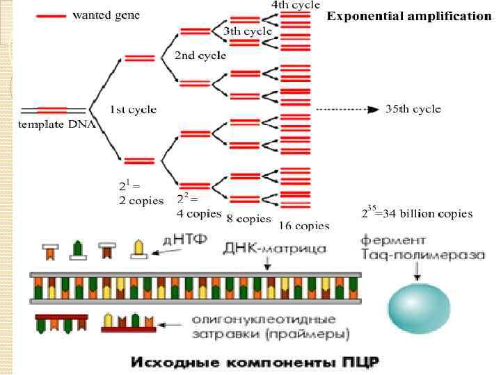 ПОЛИМЕРАЗНАЯ ЦЕПНАЯ РЕАКЦИЯ Полимеразную цепную реакцию (ПЦР, PCR) изобрел в 1983 году американский ученый Кэри Мюллис. Принцип метода заключается в удвоении (амплификации) участка ДНК, ограниченного праймерами, при помощи фермента ДНК-полимеразы. За каждый следующий цикл амплификации происходит удвоение, как исходного участка ДНК, так и вновь синтезированных фрагментов (амплификатов). В результате этого число фрагментов растет в геометрической прогрессии (цепная реакция). После 30 - 40 циклов их число превышает несколько миллиардов, что делает возможным их обнаружение различными методами.