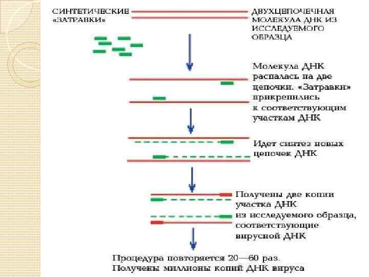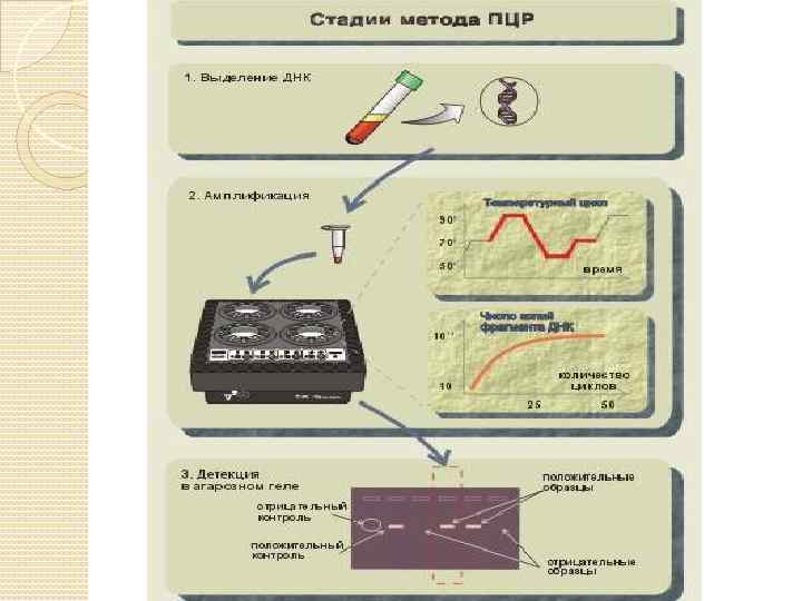 Этапы ПЦР-исследования 1. Выделение нуклеиновых кислот. На первом этапе выделяется вся ДНК или РНК из исследуемого материала. 2. Собственно ПЦР или амплификация. В раствор, содержащий смесь нуклеотидов, ПЦР-буфер, полимеразу и праймеры добавляется ДНК, выделенная на первом этапе. ПЦР проводят следующим образом: сначала реакционную смесь нагревают до температуры 90 -94° С, вызывая этим денатурацию ДНК, затем температуру снижают до 50 -70° С в зависимости от нуклеотидной последовательности праймеров, чтобы отжиг происходил в строго комплементарных участках, и наконец, в смеси устанавливают температуру, оптимальную для работы ДНК-полимеразы. При повторении этих циклов количество копий участка ДНК, находящегося между местами посадки праймеров, возрастает в геометрической