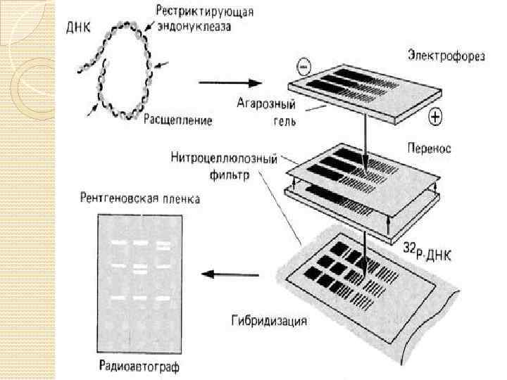 Исследуемую ДНК гидролизуют рестриктазами, фракционируют электрофорезом, переносят разделенные фрагменты на нитроцеллюлозный фильтр и проводят реакцию гибридизации с мечеными олигонуклеотидами