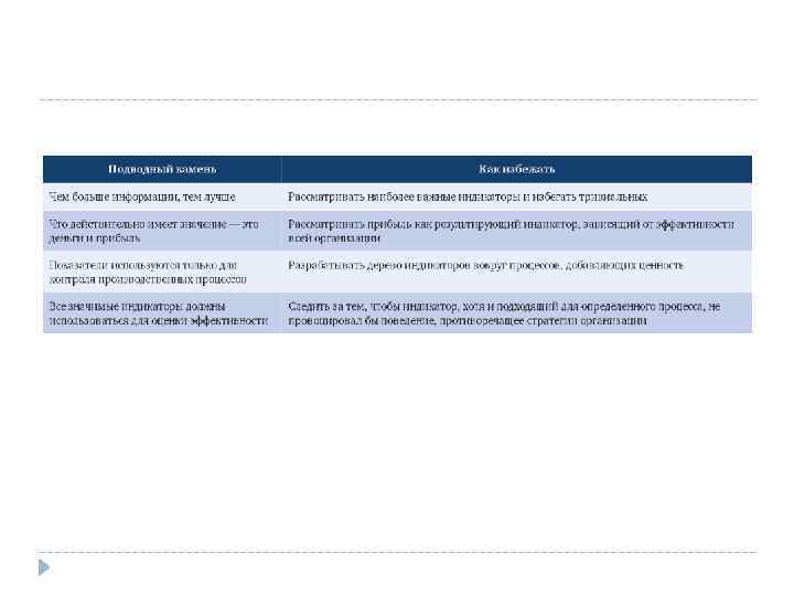 Цели Опережающие (причинные) - Lead Отсроченные (следственные) - Lag Показатели, определяющие значения других показателей по прошествии определенного времени Показатели, значение которых определяется поведением других показателей по прошествии определенного времени Увеличение продаж Степень удовлетворенности трудом менеджеров по продаже Объем продаж Разработка новых продуктов Длительность разработки продуктов Доход от продажи новых продуктов Улучшение бизнеспроцесса Степень организационной фрагментарности бизнес-процесса Стоимость бизнеспроцесса ; Время цикла бизнеспроцесса ; Показатели качества