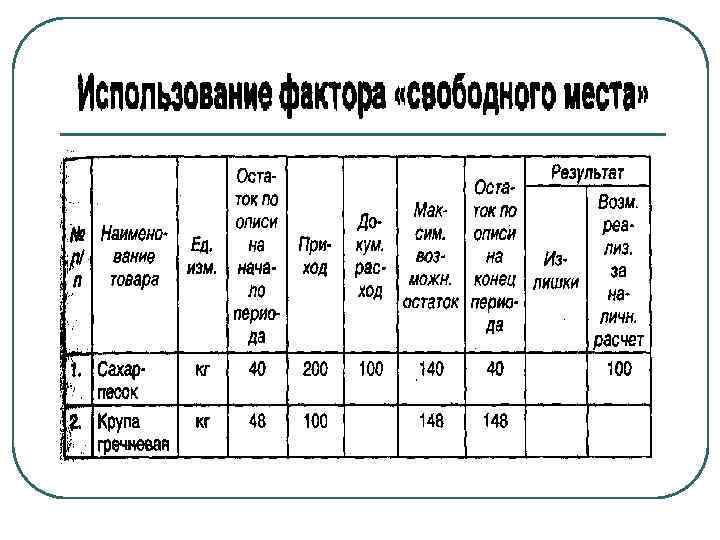 Метод восстановления количественного учета l l Применяется в торговле и общепите. Проводится когда: • Количественный учет вообще не ведется • Записи в картотеке не соответствуют • первичным документам Картотека ведется не достаточно детально (учет по средним ценам, пересортица)