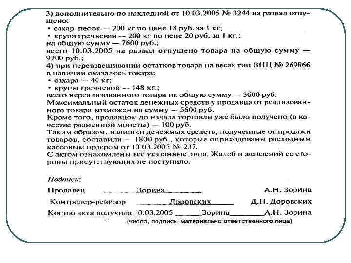 Сопоставляют: l l l документов, отражающих непосредственное совершение хозяйственной операции, с документами, имеющими к первым косвенное отношение (сопоставление материального отчета о расходе сырья и материалов с данными карточек складского учета); документов, отражающих хозяйственную операцию, с документами, оформление и содержание которых обусловливается непосредственно первичными документами (включение в акт выполненных работ таких объемов, на которые не оформлены наряды, и пр. ); регистров бухгалтерского учета с данными первичных документов, что позволяет установить наличие фиктивных записей, сделанных с целью сокрытия хищений и злоупотреблений.