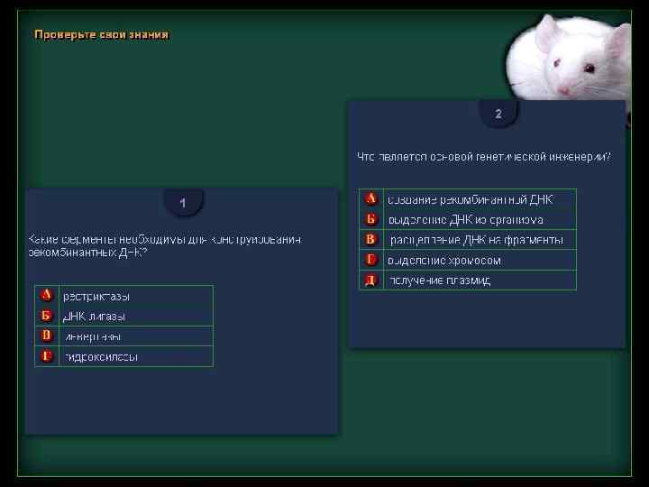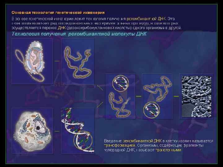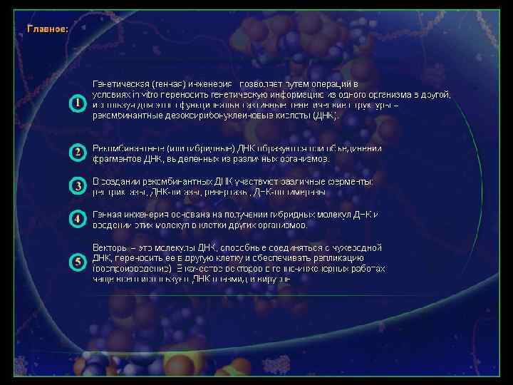 Вакцины 3. Клонированные гены, кодирующие основные антигенные детерминанты патогенного организма, встраивают в геном непатогенного носителя (обычно вируса) и получают живую безопасную, не содержащую болезнетворных микроорганизмов вакцину. Жи вые акцины, как правило, более эффективны, чем в неживые или субъединичные. Противогерпетические вакцины. Противосальмонеллезные вакцины. Цитокины Экзогенный человеческий ИФН получают, используя технологию рекомбинантных ДНК. Процедура выделения к. ДНК интерферонов состоит в следующем: Из лейкоцитов человека выделяют м. РНК, фракционируют ее по размерам, проводят обратную транскрипцию, встраивают в сайт модифицированной плазмиды. Полученным продуктом трансформируют Е. coli, образовавшиеся клоны подразделяют на группы, которые идентифицируют. Каждую группу клонов гибридизируют с ИФН м. РНК. Из образовавшихся гибридов, содержащих к. ДНК и к. РНК, выде ляют м. РНК, проводят ее трансляцию в системе синтеза белка. Определяют интерферонную противовирусную активность каж дой смеси, полученной в результате трансляции. Группы, про явившие интерферонную активность, содержат клон с к. ДНК, гибридизировавшийся с ИФН м. РНК; повторно идентифици руют клон, содержащий полноразмерную ИФН к. ДНК че ловека.